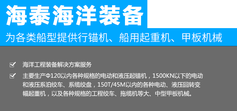 江蘇海泰海洋裝備有限公司位于素稱“銀杏之鄉(xiāng)”的泰興市,2018年投資建設(shè),至今已經(jīng)成為產(chǎn)品研發(fā)、生產(chǎn)制造,調(diào)試服務(wù)為一體的設(shè)備配套企業(yè)。公司從事海洋裝備(設(shè)備)及配件的制造、設(shè)計、安裝,維修;船用錨機、絞車、起重機、舾裝件、電氣設(shè)備、環(huán)保設(shè)備設(shè)計、制造。公司成立以來,就與中國船舶工業(yè)集團(tuán)公司第701所、702所、704所、708所、上海船舶研究設(shè)計院等多家船舶科研院所建立了技術(shù)合作關(guān)系,產(chǎn)品應(yīng)用于......